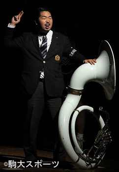 「(今日の思いは)やりきれたという気持ちでいっぱい。(4年間の思い出は)選手の方々は駒大を背負って全力で頑張ってくれて、選手が頑張っているからこそ、自分も頑張れた。選手が頑張ってくれているだけで嬉しかった。(4年間で一番印象に残っているのは)2つあって、硬式野球部が1年生の時に日本一になった時と先日1部昇格を果たした時。日本一を達成した時の景色とこの前の一部昇格の景色が重なって見えた。今でも思い出すだけで嬉しい。(同学年の)4年生選手は、苦しんだのを見てきているから嬉しいし。(なぜ昇格できたと思うか)去年とは雰囲気が違った。高校時代に自分もスポーツをやっていたので、チームワークの大切さはよく分かる。『見えない力』が選手たちを動かしていた。選手たち自身でもそういった雰囲気を作れていた。それに尽きる。一つの目標に向かって、全力でやっていたからこそ、こういった結果を出せたのだと思う。雰囲気から良かった。(今日、学注の舞台に立って)もう集大成なので、全て出し切ろうと臨んだ。(後輩たちに向けて)苦しいことも絶対にあるとは思うが、大学を盛り上げるため、自分のため、とおのおの頑張っている。それに負けず、後輩たちも頑張って体育会を応援してほしい。体育会を応援すれば、應援指導部ももっと大きくなるし、應援指導部が大きくなれば、駒大がもっと盛り上がる。皆で駒大をガンガン盛り上げてほしい」